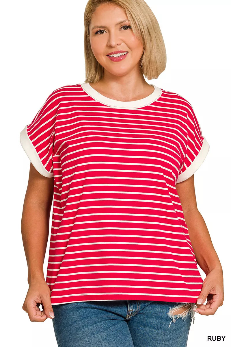 Zenana Full Size Contrast Trim Cap Sleeve Stripe Tee Plus Size
