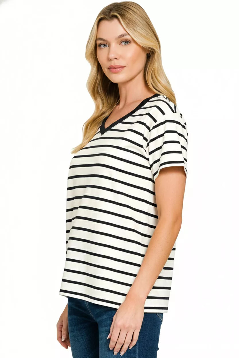 Zenana Striped V-Neck Short Sleeve T-Shirt